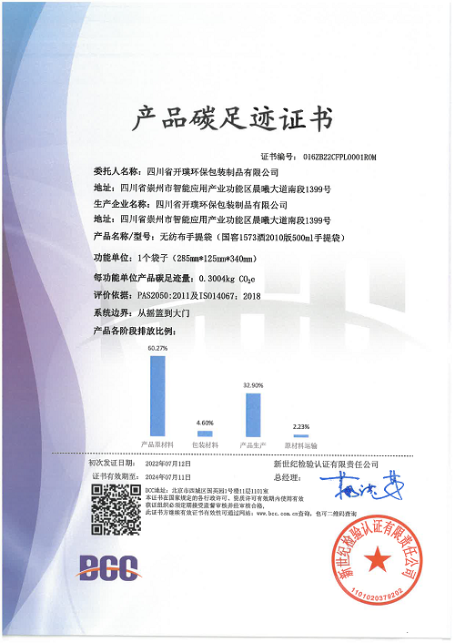 BCC審核組采用現(xiàn)場與遠程審核相結(jié)合的形式,依據(jù)PAS 2050:2011及ISO 14067:2018標準,對開璞環(huán)保的無紡布手提袋(國窖1573酒2010版500ml手提袋)進行產(chǎn)品碳足跡核查。