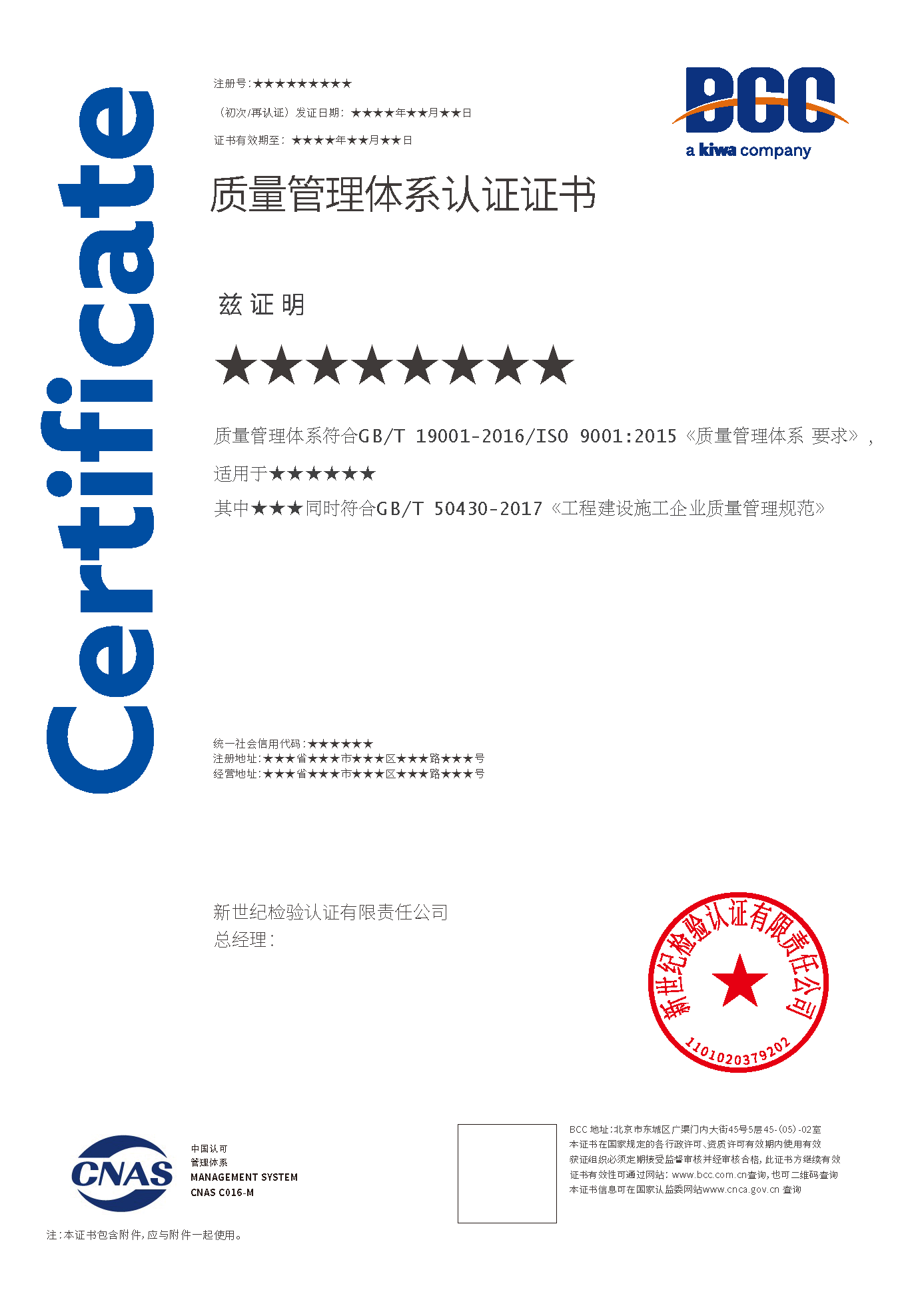 工程建設施工企業(yè)質量管理體系認證適用于建設施工單位(住建部頒發(fā)資質的施工企業(yè)),既可以用于施工總承包的單位,如:建筑工程、市政公用工程、電力工程、公路工程、鐵路工程、機電工程等;此外,還可用于專業(yè)承包的單位,如:防水防腐保溫工程、建筑裝修裝飾工程、消防設施工程、建筑幕墻工程、電子與智能化工程、建筑機電安裝工程、環(huán)保工程、鋼結構工程等。