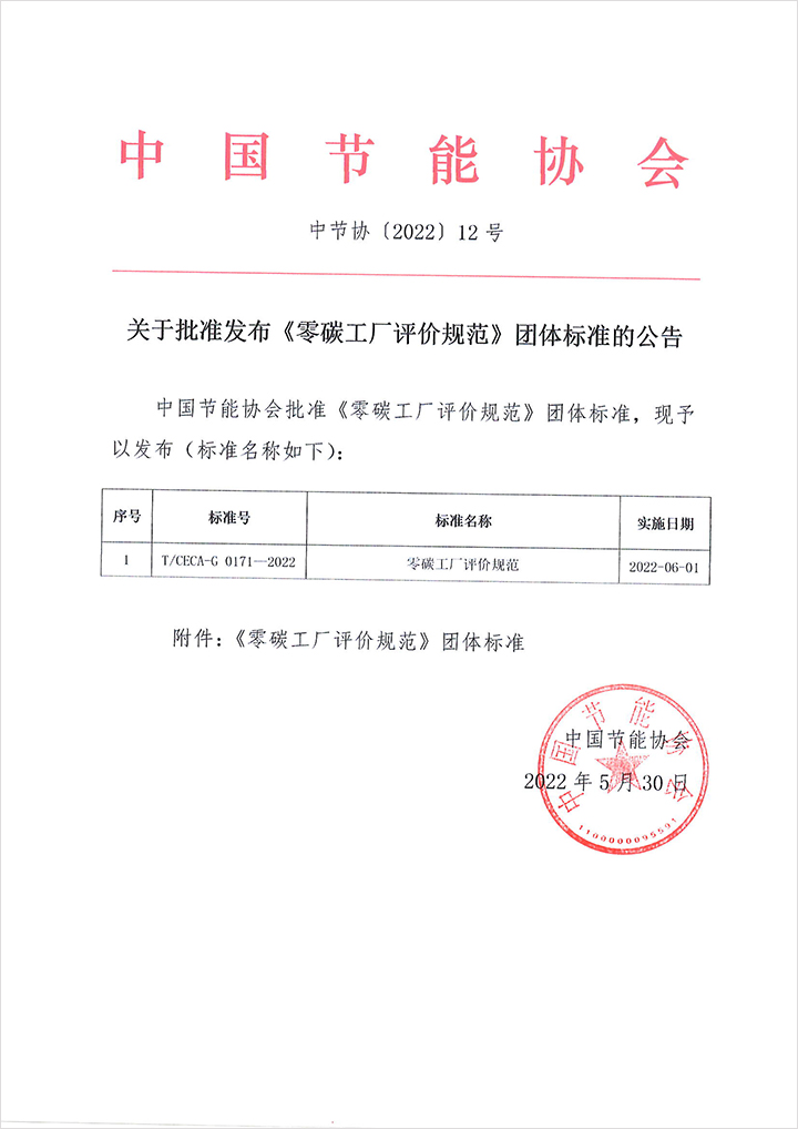 關于批準發(fā)布《零碳工廠評價規(guī)范》團體標準的公告