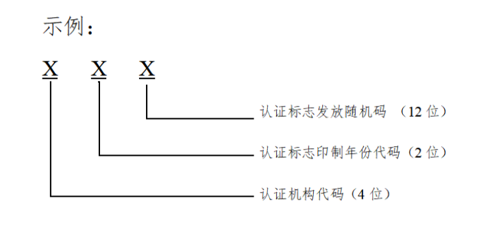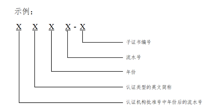 內資認證機構認證證書編號為該機構批準號的3位或4位阿拉伯數(shù)字流水號;外資認證機構認證證書編號為F+該機構批準號的2位或3位阿拉伯數(shù)字流水號。