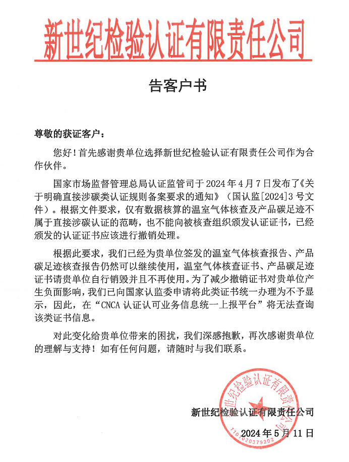 關(guān)于涉碳認(rèn)證情況告客戶書
