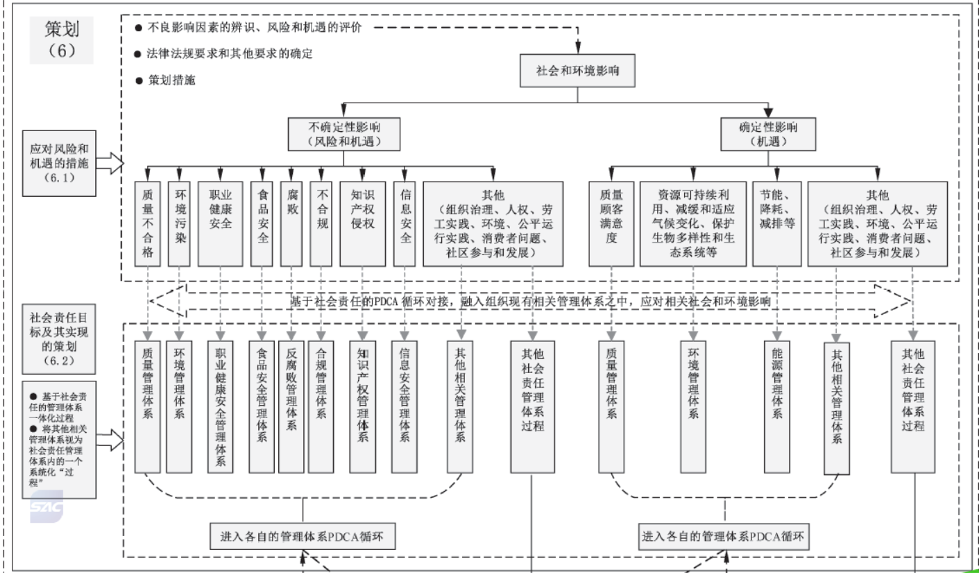 使組織能夠以社會責任為抓手,從頂層治理(價值觀、使命、精神和發(fā)展戰(zhàn)略等)視野出發(fā),統(tǒng)領、規(guī)范、協(xié)調和融合組織內其他相關管理體系(如質量管理體系、 環(huán)境管理體系、職業(yè)健康安全管理體系、食品安全管理體系、反腐敗管理體系、合規(guī)管理體系、知識產權管理體系、信息安全管理體系等),有效實現組織管理體系的一體化。